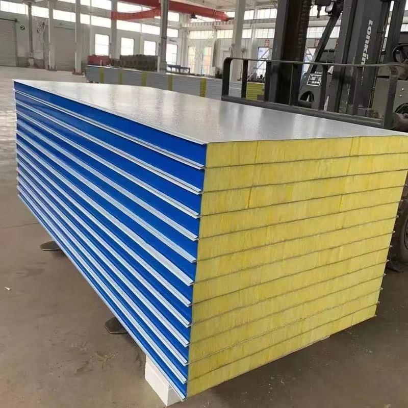 岩棉彩钢夹芯板产品特点:防火性能好,岩棉物为内芯层或玻璃纤维,可适合任意防火等级要求